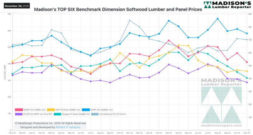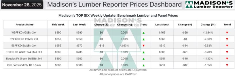 In the week ending November 28, 2025, the price of benchmark softwood lumber