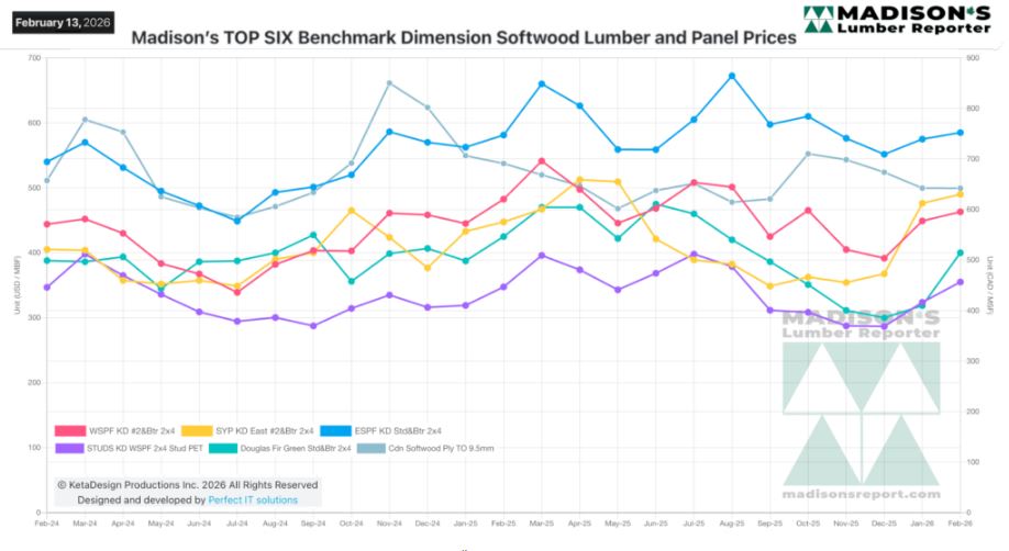 In the week ending February 13, 2026, the price of benchmark softwood lumber