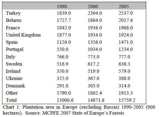 Plantation area in Europe (excluding Russia) increased by