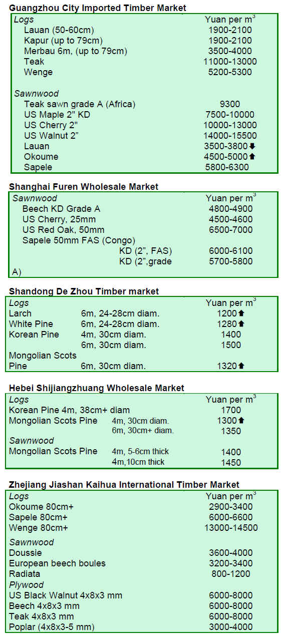 At the end of 2009, Russia did not increase the tariff on log exports as announced earlier in the year so prices did not increase. This came as good news to Chinese importers. The brighter prospects in the Chinese economy contributed to the increase in domestic market demand and increased imports.