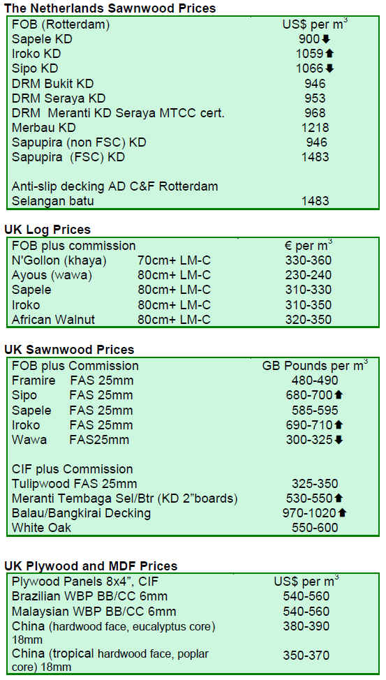 CIF prices quoted in euros to European buyers for African sapele, iroko and sipo are generally firming. However, as in other sections of the European tropical wood market, importers report that end-user consumption is still very patchy and there is little market acceptance of the need to pay higher prices.