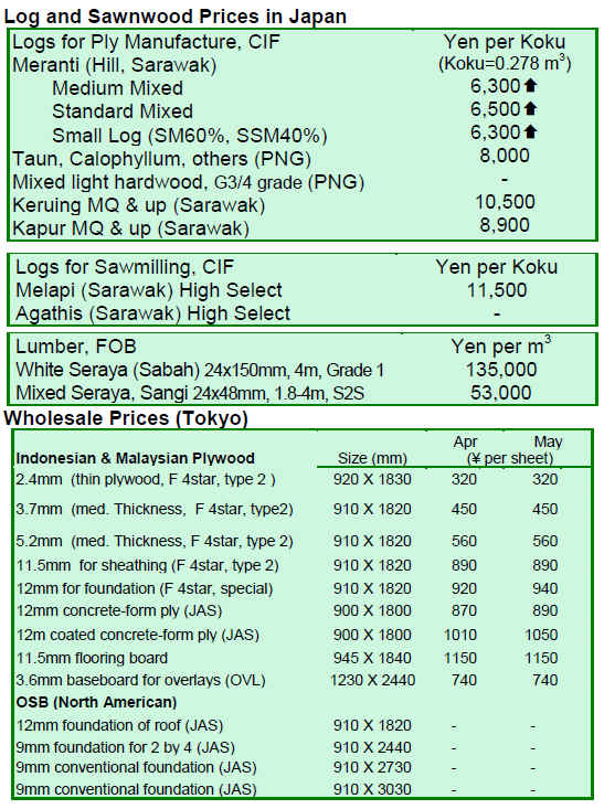 Market prices for Sarawak Meranti Regular are currently around Yen 6,400-6,500 per koku CIF up Yen 100 from the level in April. Prices of Yen 5,400 for Meranti Small are also up Yen 100. The JLR is forecasting Meranti Regular prices as high as Yen 7,000 if the bullish attitude of suppliers continues.