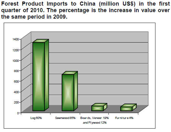 In the first quarter of 2010, total log imports to China were 7.7 million cu.m valued at US$1.3 billion, up 37% in volume and 60% in value over the same period last year.
