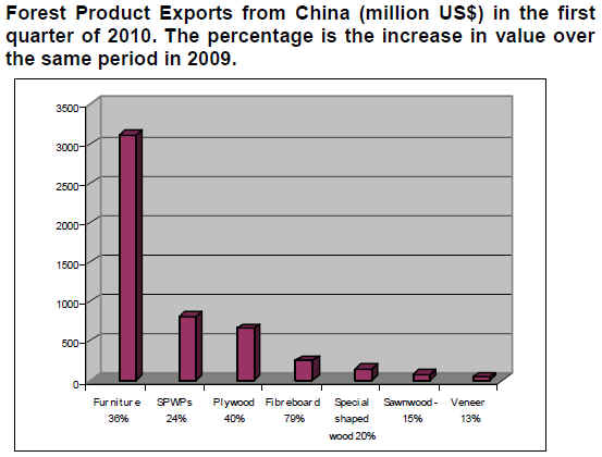 The total value of wooden furniture exported was US$3,119 million, up 36% from the first quarter period of last year. Data from China Customs showed that wooden furniture is still the major timber product exported.
