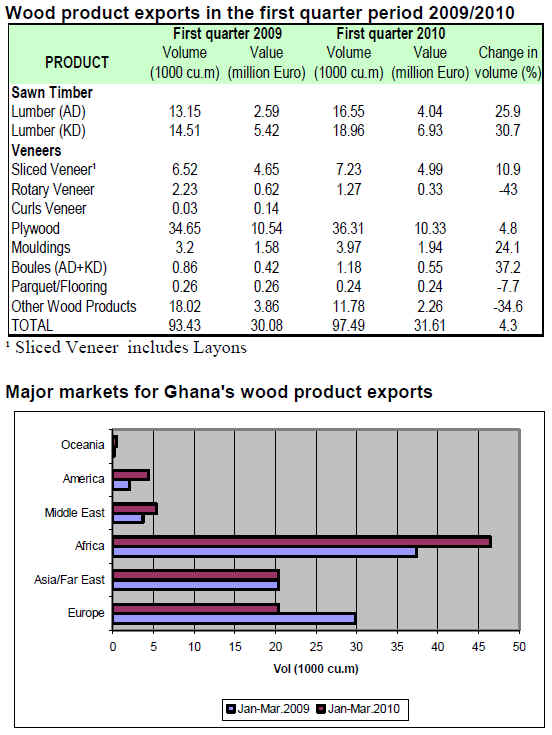 Ghana¡¯s first quarter wood products exports in 2010 amounted to 97,490 cu.m, worth EUR31 million. Compared with the same period last year, exports showed a 4.3% increase in volume. Exports to other African countries accounted for 40% of the total export value for wood products.