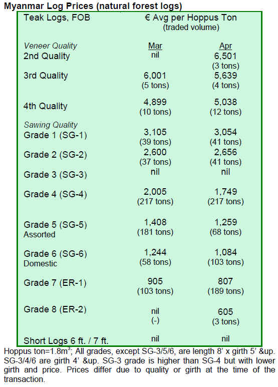 Teak log prices fluctuated with news of possible price cuts in March 2010. Instead, the Myanmar Timber Enterprise (MTE) proposed higher teak and pyinkadoe prices in May.
