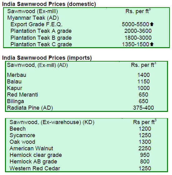 Laurel and Haldu were the main non-teak species traded and prices were around US$698 per cu.m for first quality logs, US$388 per cu.m for medium quality logs and US$116-194 per cu.m for lower quality logs.