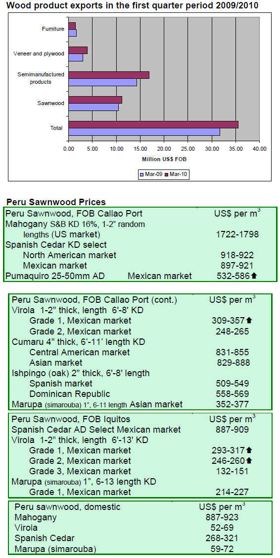 The Export Association of Peru (ADEX) reported that exports of wood products in March 2010 were US$13.3 million, up 9% compared to March 2009. Three main buyers were China, the USA and Mexico accounting for 82% of the total volume of exports.