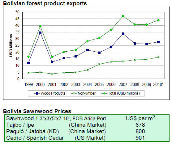 Forest product exports from Bolivia totalled US$44 million in the first quarter of 2010, up 8.2% from US$41 million in the same period last year.