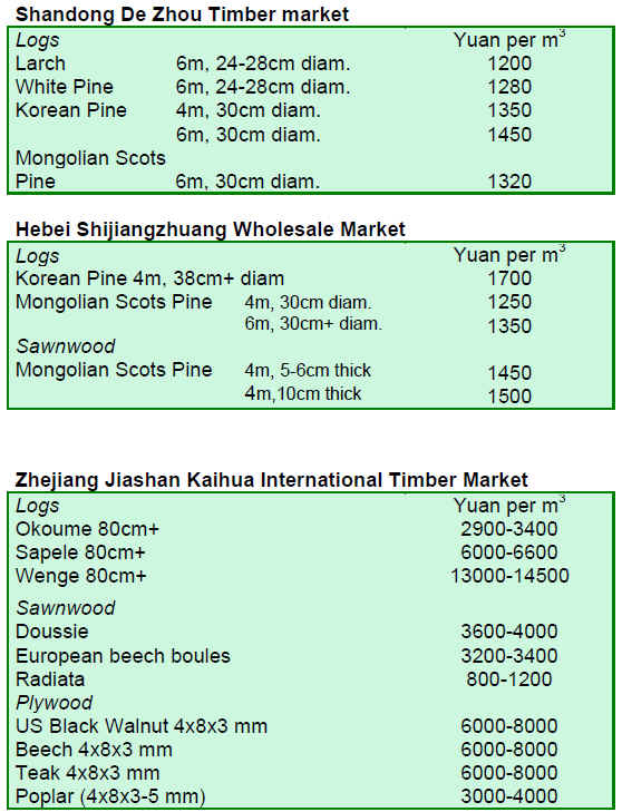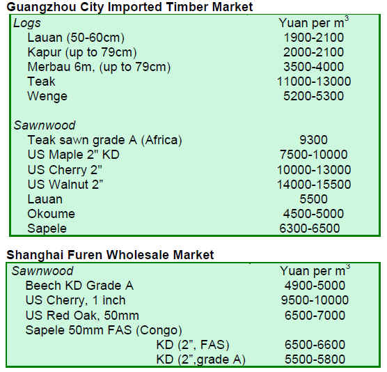 Prices for some wood products have shown an upward trend. Eucalyptus logs (8cm&up) were RMB600 per cu.m, up 13% over the same period in 2009.
