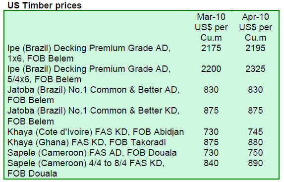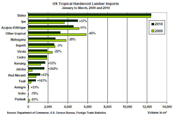 Balsa lumber imports from Equador were at the same level as in the first quarter last year. Imported volumes of Ipe, Jatoba, Keruing, Red Meranti and Teak were significantly higher compared with the same period in 2009. Acajou d¡¯Afrique lumber from Cote d¡¯Ivoire declined by over 50%, but imports from Ghana and Cameroon were up.