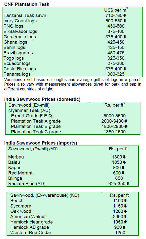 Auctions of teak continued to attract active buying in the Central India log depots with US$38-57 per cu.m higher prices than in previous auctions. Sawing quality teak logs 3 metres and up fetched around US$1359 per cu.m, medium quality US$1133 per cu.m and logs between 2 and 3 metres long were priced at around US$906 per cu.m.