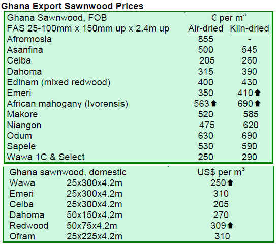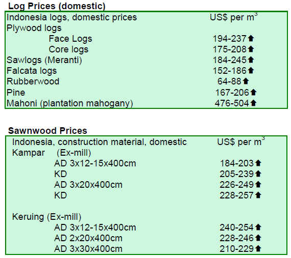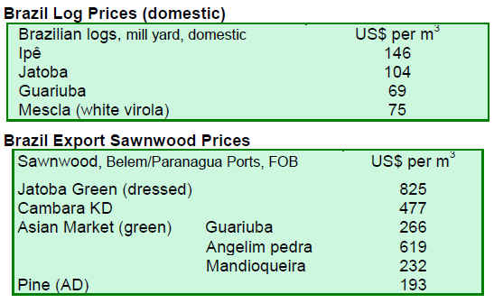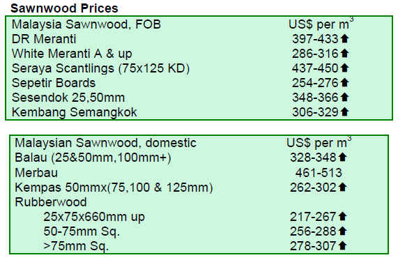 Analysts suggest that there may be some pick up in orders in late August at the close of the European vacation season, but apart from this, the prospects are not for any immediate recovery in demand for sawnwood. Sawnwood and log prices were unchanged through June 2010.