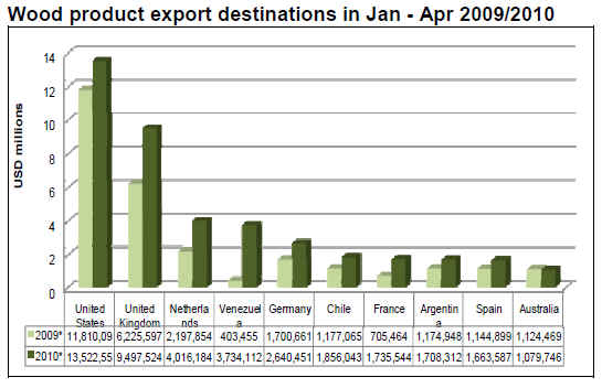 In May 2010, exports of timber products (except pulp and paper) jumped 27% compared to values in May 2009, from US$177 million to US$226 million.