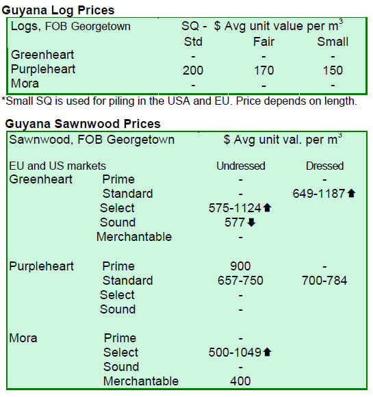 Prices for rough sawn (undressed) greenheart (select) sawnwood improved as did the prices for purpleheart and mora.