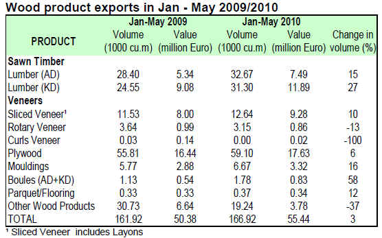 For the period under review export volumes of both air and kiln dried boules, air and kiln dried sawnwood, and mouldings increased 58%, 15%, 27% and 16% respectively in comparison to the same period in 2009.