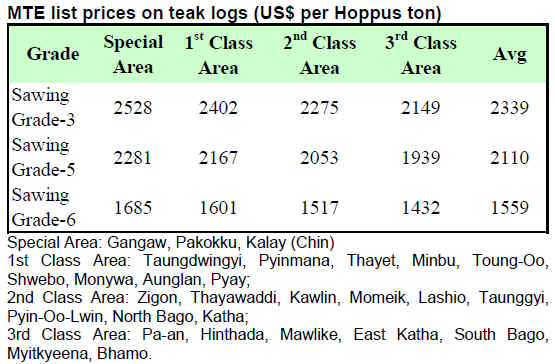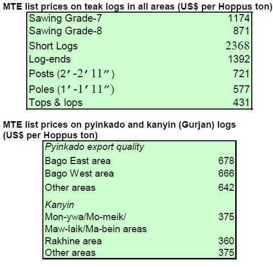 The following price tables show Myanmar Timber Enterprise (MTE) list prices for direct sales contracts in use since September 2008. All prices quoted are US$ per Hoppus ton. Current tender market prices are US$200 to 250 per Hoppus ton over the MTE list prices.