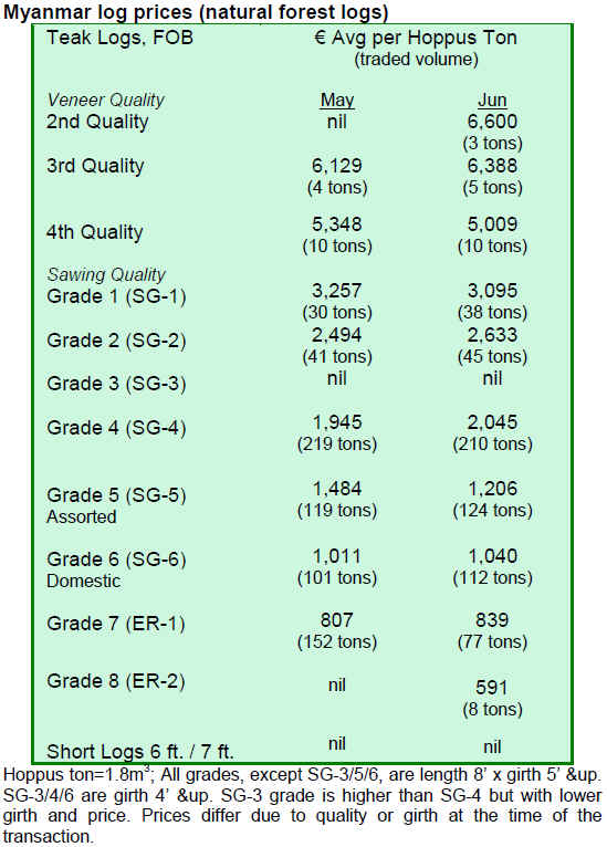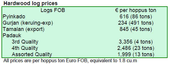 The Myanmar Timber Enterprise uses Euro in its tender sales and US$ in its direct sales contracts. Some traders have been able to take advantage of fluctuating exchange rates and so the trade has picked up. According to some analysts, a slight easing of sales and shipments is possible if exchange rates become more stable.