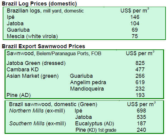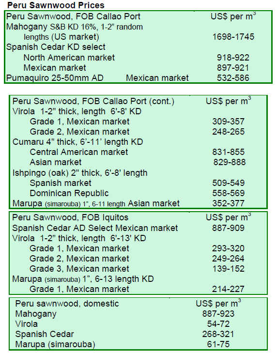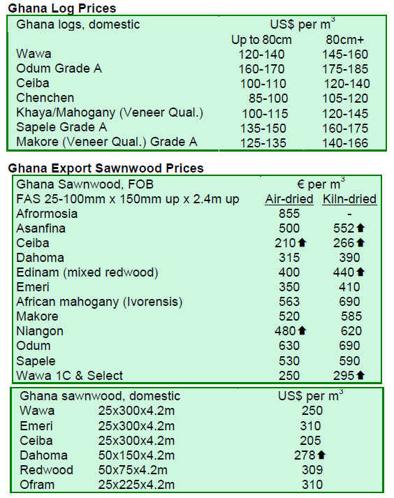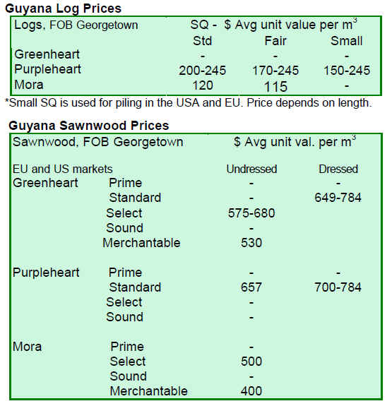 Prices for both dressed and undressed greenheart sawnwood and undressed mora sawnwood decreased, while prices for dressed purpleheart were firm.