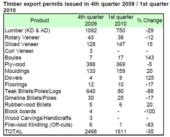 Compared to the last quarter in 2009, first quarter approvals fell sharply by 34.7%. Lumber export permits declined as did the number of export approvals for rotary veneer, curl veneer, plywood, flooring, gmelina billets/poles, block boards, wood carvings/handicrafts, firewood kindling¡¯s (off-cuts) and teak billets/poles/logs. However, export permits for sliced veneer, boules, mouldings and dowels increased considerably.