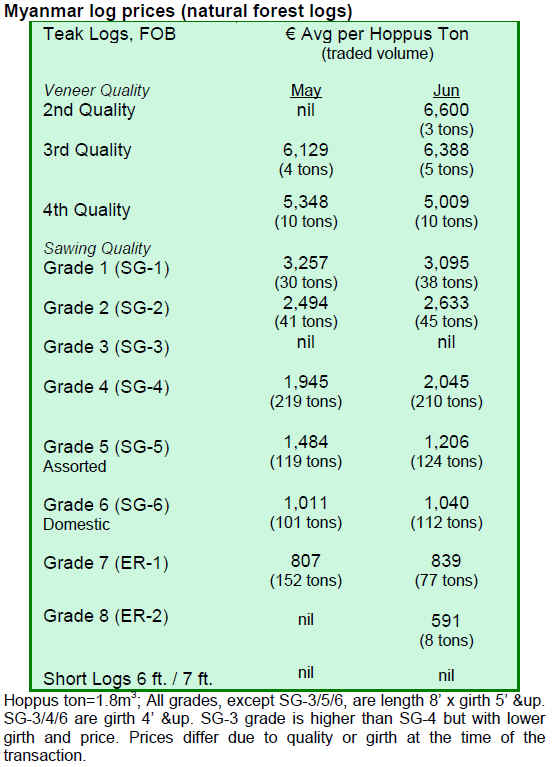 Some big dealers say that demand for teak is low except for SG7 logs. All in all, buyers expect that July is going to be a quiet month for timber sales. The sluggish market situation for teak can be seen from the falling prices in the tender sales during 2010.