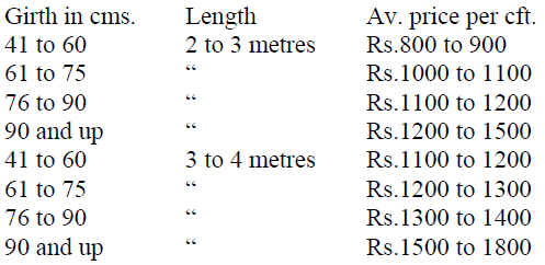 Long length teak logs suitable for boat building fetched around Rs.2000-2200 per cft. Premium quality saw logs were priced at Rs.1800 per cft., medium quality at Rs.1500 per cft. and average quality attracted prices of Rs.1200 per cft.