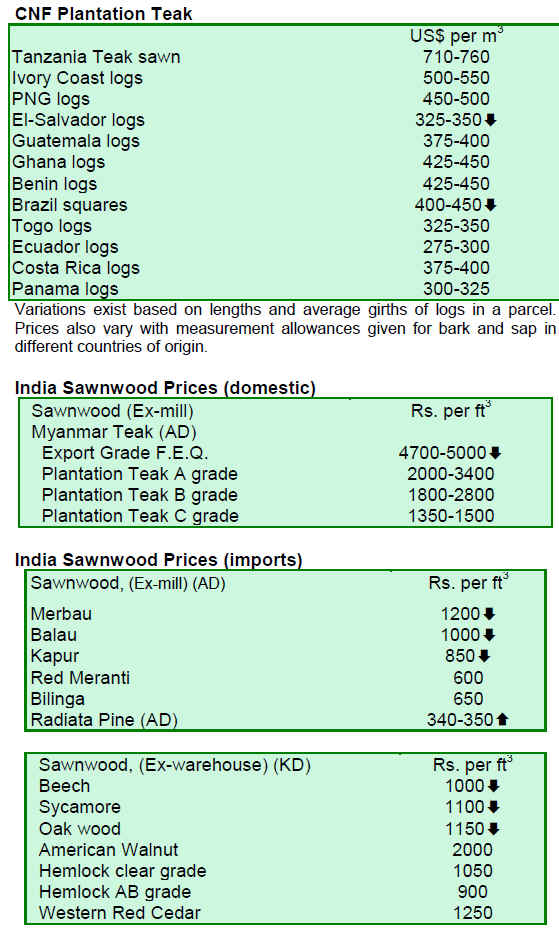 Demand for logs remains down as the South West Monsoon season has caused a break in housing activity. The strong Rupee against the US dollar also makes imported teak log prices lower for Indian buyers.