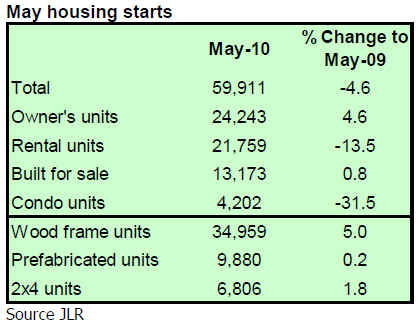 After positive figures recorded in April, housing starts relapsed in May, reports JLR. The total of 59,911 units recorded was the lowest ever for the month of May.