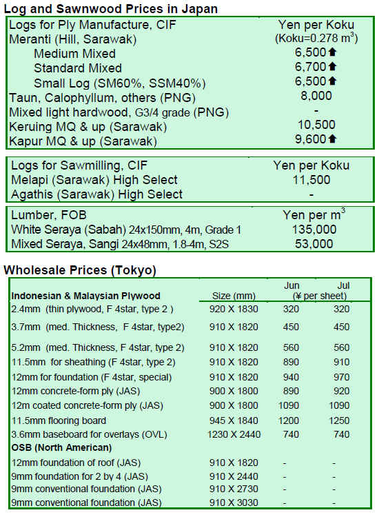 Tropical log supply is still affected by bad weather conditions and prices have been inching up in the last few months. Local plywood mills in Sarawak reportedly have strong order books and their aggressive purchasing is lifting the prices. Japanese log importers say that the tight log supply is going to last at least until late August.
