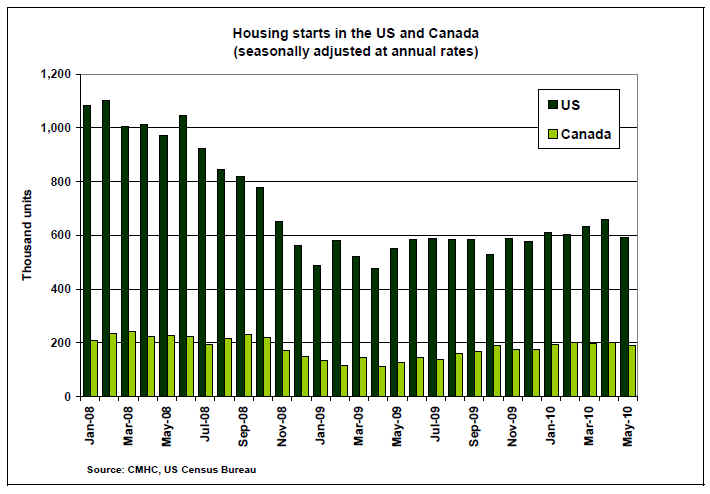 In Canada, housing starts declined from April to May, according to Canada Mortgage and Housing Corporation (CMHC), but the decrease in starts is consistent with CMHC¡¯s overall forecast for 2010. Following a total of 149,081 units in 2009, housing starts are expected to be 166,900 to 199,600 units in 2010. For 2011, housing start forecasts are in the range of 148,600 to 208,800 units, according to CMHC. The agency predicts that the stricter criteria for government-backed mortgages that were introduced in April will lead to long-term stability in the housing market and a better balance between supply and demand for homes.