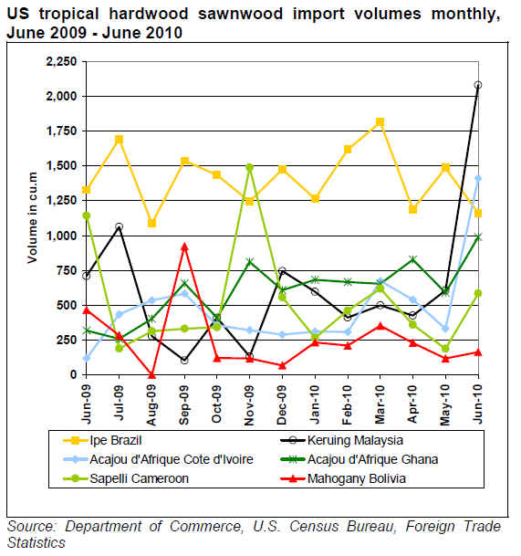 The US imported 20,657 cu.m of tropical sawnwood in June 2010, up from 14,652 cu.m in May. The top three imported species were balsa (5,608 cu.m), acajou d¡¯Afrique (3,783 cu.m) and keruing (2,128 cu.m). Imports of most species increased from May with the exception of ipe, mahogany, red meranti and padauk. In June, the exports of species from South East Asia and Africa picked up significantly due to the exhausted inventories and low availability from South America. In Brazil, some sawmills have reportedly shut down or the domestic market is consuming all the production leaving no exports to the US. The depreciation of the Euro against the US dollar pushed up the tropical sawnwood imports priced in Euro, e.g. imports from African countries. Monthly import volumes of key imported species by country of origin are shown in the chart below.
