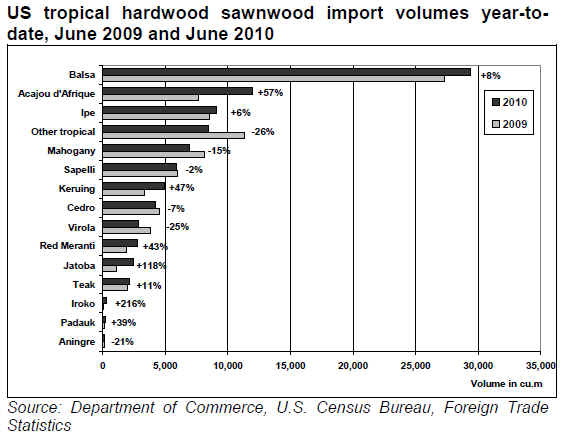 Year-to-date, import volumes of tropical sawnwood increased by 7% compared to the same period in 2009. Among the species that gained significantly in the period to June 2010 are acajou d¡¯Afrique (+57%), keruing (+47%), red meranti (+43%) and jatoba (+118%).