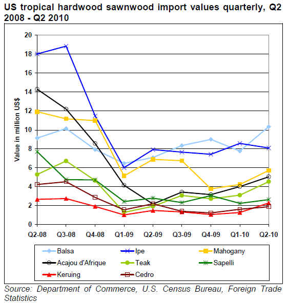 The volumes of tropical sawnwood imported into the US have recovered somewhat from 2009. However, in value terms, imports remain much lower than in 2008, albeit import values have been going up in 2010. Exchange rate fluctuations also have had an influence, first the drop in the value of the US dollar, which further depressed sales to the US market, and recently the weaker Euro favoured sales of products priced in Euro.