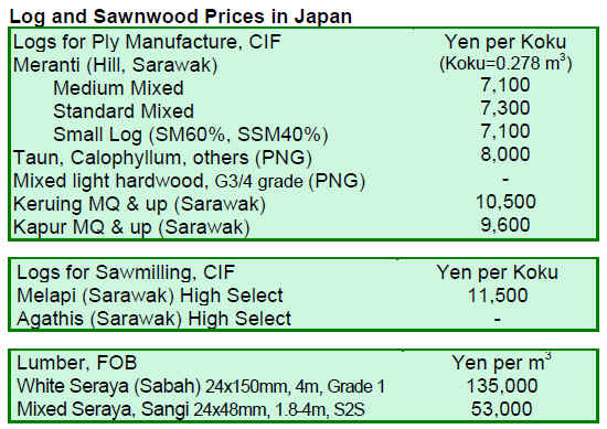 However, tropical timber export prices quoted in US dollars are tending to increase as currencies in South East Asian countries appreciate. This undermines the competitiveness of South East Asian timber against the European and North American imports by Japan.