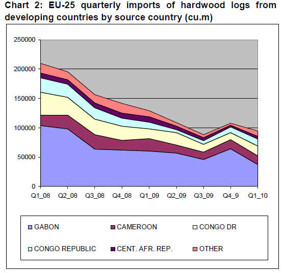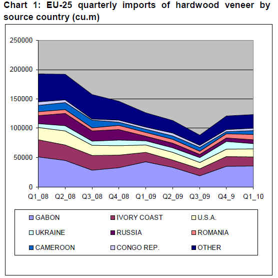 Chart 1 on page 15 shows that Europe¡¯s imports of finished veneers declined progressively from the second quarter of 2008 and then staged a recovery from the third quarter of 2009. However, it also shows that the overall pattern of trade was strongly influenced by events in Gabon which mainly supplies rotary rather than sliced veneers. If Gabon is excluded, the indications are that while European imports of sliced veneers fell rapidly during 2008, they have remained remarkably stable at a low level since then. It also suggests very little change in the market share of countries supplying sliced veneer to Europe over the last 2 years.