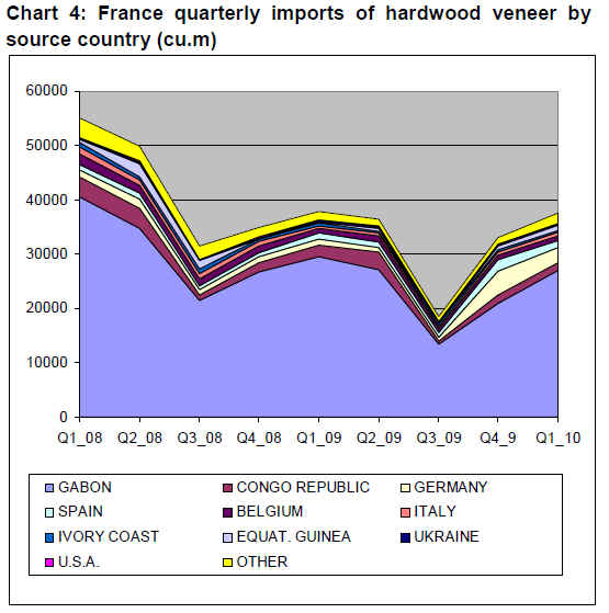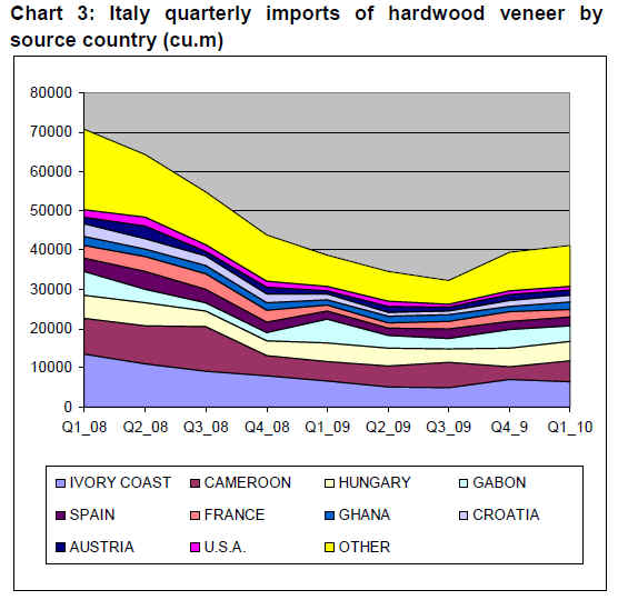 Chart 3 showing hardwood veneer imports into Italy (mostly sliced veneers), suggests that this market segment has been recovering slowly since the third quarter of 2009.