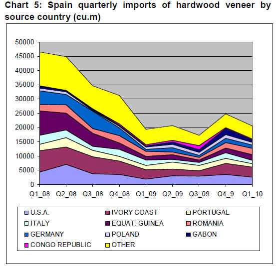 Chart 5 on page 15 reveals the very deep decline in Spanish imports of hardwood veneers from the second quarter of 2008 onwards as construction activity collapsed. A brief revival in imports towards the end of 2009 proved to be short-lived. Recent reports from the Spanish door industry suggest little prospect of any significant upturn in demand in the immediate future.