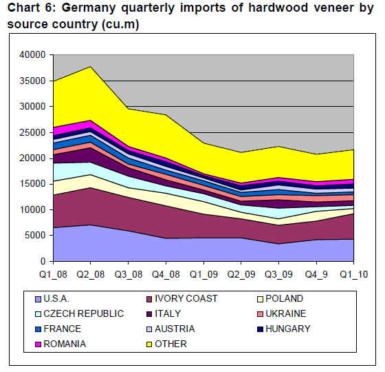Chart 6 shows that German imports of hardwood veneer fell consistently and steeply in the 12 months to end June 2009 and have remained stable at a low level since then. However, one positive recent trend for tropical hardwoods is the significant increase in the share of Ivory Coast in overall German hardwood veneer imports since the third quarter of 2009.