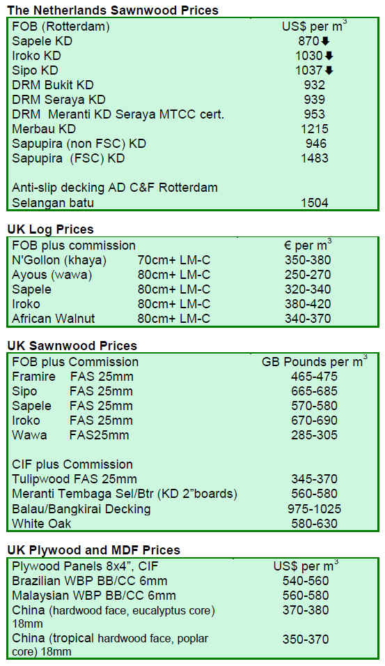 Meanwhile, other factors are playing a critical role to influence the direction of the hardwood trade. For example, the general weakening of the Euro in relation to the US$ combined with low levels of availability of products and associated firm prices from Southeast Asia and Amazonia, are now significantly boosting prospects for African hardwoods in the European market.