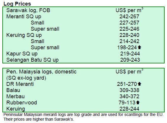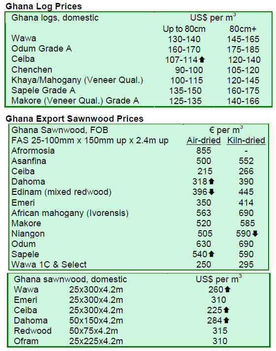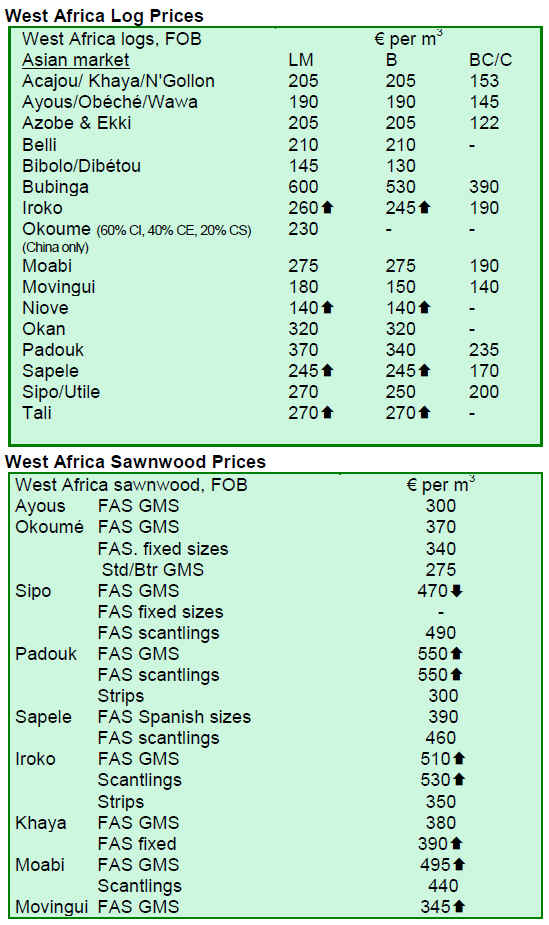 Iroko logs are still in good demand and sawnwood prices also gained due to increased demand from European and Asian buyers. Sapele log prices are a little higher and demand for niove logs for the Indian market remains steady lifting prices. Okoum¨¦ log prices also inched up, even though supply from Equatorial Guinea and Congo Brazzaville is now sufficient to meet demand in consumer countries, says an analyst.