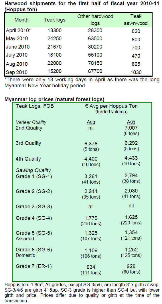 Harwood shipments in the first half of fiscal year 2010-11 registered a downward trend. However, teak sawnwood exports exceeded the level of 1,000 Hoppus tons in September.