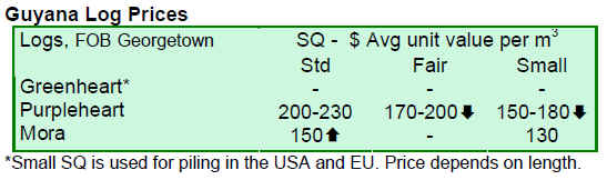 For the period under review, there were no greenheart log exports. Purpleheart log prices remained unchanged for standard sawmill quality, while prices for fair and small sawmill quality decreased. Mora log prices remained stable for this period.