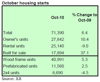 October housing starts improving from last year The seasonally adjusted housing starts fell from September 2010 by 2.9% to 813,000 in October 2010. Wood frame units were up by 5.3% over October last year and these constituted about 57% of the total housing starts in October 2010.