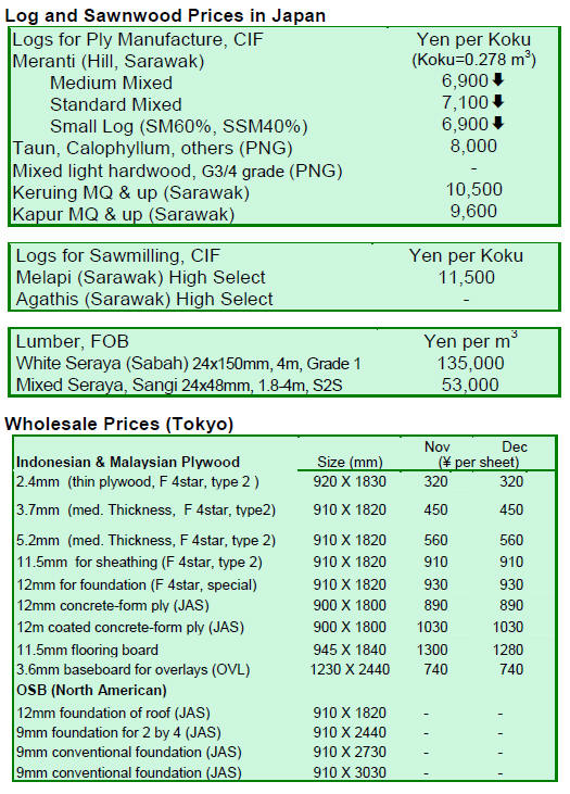 According to the JLR, log shortages at the ports in Malaysia are severe and many ships are waiting for cargos. This, in turn is driving up demurrage and total shipping costs. Shipping companies are now asking US$47-48 per cu.m, up US$1 per cu.m from November. According to importers, loading time is normally one week, but due to log shortages it is currently 10-14 days. In Sabah, log export prices at Tawau port for mix serayah logs are at US$230-235 per cu.m FOB, up US$5-7 per cu.m from November. White serayah log prices fetched US$250 per cu.m FOB. Kapur prices gained US$5 per cu.m from a month ago to US$275-280 per cu.m FOB, while keruing log prices jumped US$20 per cu.m to US$260 per cu.m FOB. Keruing log prices for sawnwood (70-80 cm & up) fetched US$275-285 per cu.m FOB. In Sarawak, meranti regular log export prices at Tanjonmani port are at US$245 per cu.m FOB, gaining US$10 per cu.m from a month ago and US$65 per cu.m (up 27%) from the beginning of the year. Small meranti prices are at US$210 per cu.m FOB, up US$70 per cu.m (up 34%) from the beginning of the year, however, current asking prices are closer to US$215 per cu.m. Kapur log prices are at US$300 per cu.m FOB. According to JLR, the Japanese market for hardwood logs is firming after frenetic buying due to the strong Yen in recent months. In addition, some manufacturers have been rebuilding their stocks ahead of the rainy season in producer countries. Currently, the appreciation of Yen has eased but CIF prices have trended upwards since early November. Plywood mills in Japan utilising imported tropical hardwood logs have maintained their reduced production levels at around 70% of full capacity for more than a year. In Japan, CIF prices gained Yen 100 from November to Yen 7,200-7,300 per koku for Sarawak meranti regular logs and to Yen 6,100-6,200 per koku for small meranti logs. Super small meranti log prices stood at Yen 5,800-5,900 per koku, unchanged from November. Sharp fall of plywood imports from Malaysia October plywood imports amounted to 223,800 cu.m, the lowest level this year and around 40,000 cu.m less than the monthly average during 2010. The major cause for the overall fall is that plywood imports from Malaysia plummeted 42% compared to October last year. According to JLR, the main factors for the curtailed plywood supply are the log shortage and the appreciation of Malaysian currency against the US dollar. However, October plywood imports from Indonesia amounted to 72,000 cu.m, up 20.4% compared to October last year.
