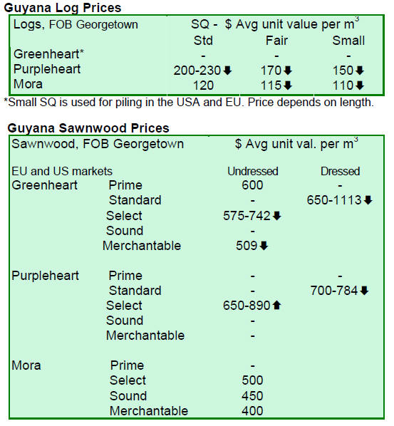 Timber trade remains quiet following holidays For sawnwood, undressed greenheart fetched favourable prices for all qualities except sound quality. Undressed purpleheart prices hit US$890 per cu.m in select quality while undressed mora prices continued to hold. However, prices for dressed greenheart and purpleheart were slightly down in the period under review. Guyana¡¯s Washiba (Ipe) attracted an average price of $US1,150 per cu.m. Dressed bulletwood (Macaranduba) reached US$954 per cu.m, dressed kabukalli (Cupiuba) US$975 per cu.m and undressed locust (Courbaril) US$1,166 per cu.m with the Asian, Caribbean and North American markets being the main destinations. Roundwood and fuelwood made notable contributions to the total export earnings with favourable prices in this fortnight period. Splitwood prices also held on a high level of US$956 per cu.m. For the period under review, exports of value-added products were limited. Some products such as doors and mouldings made from crabwood (Andiroba), locust (Courbaril), kabukalli (Cupiuba), purpleheart (amarante) and tauroniro (Cumaru) contributed to total export earnings.