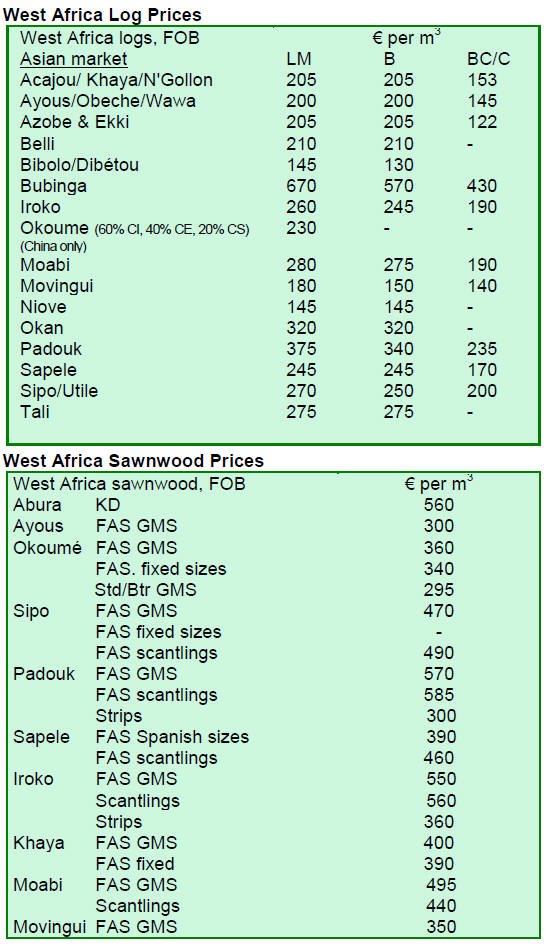 1. CENTRAL/ WEST AFRICA Sustained log demand from India and China For the West and Central African producers, sustained log demand from India and China is expected to maintain the stability in price through the first quarter. No price changes for logs and sawnwood are reported during the period under review, although, some producers are of the opinion that log prices for the prime species may firm up in the next few weeks. Prospects for sawnwood dependent on recovery in Europe Sawnwood prices will continue to be responsive to sudden fluctuations in demand as well as to how quickly producers are able to match supply with demand. For example, it is reported that the price of sapele sawnwood is once again weakening following expansion in its production despite falling demand. Generally, sawnwood prices have remained unchanged during the past four weeks. Cameroon to re-impose log export quota Meanwhile, there are continued rumours that Gabon may relax the total log export ban imposed since April 2010. Some observers were expecting an announcement of the relaxation last month but to date there is no indication of an imminent change. There is speculation that Congo Brazzaville may follow Cameroon in re-imposing the log export quota which has been relaxed to assist producers through the global recession in 2008/09. Buyers are observing the situation keenly as any changes may affect log supply and prices which have remained stable in the second half of 2010.