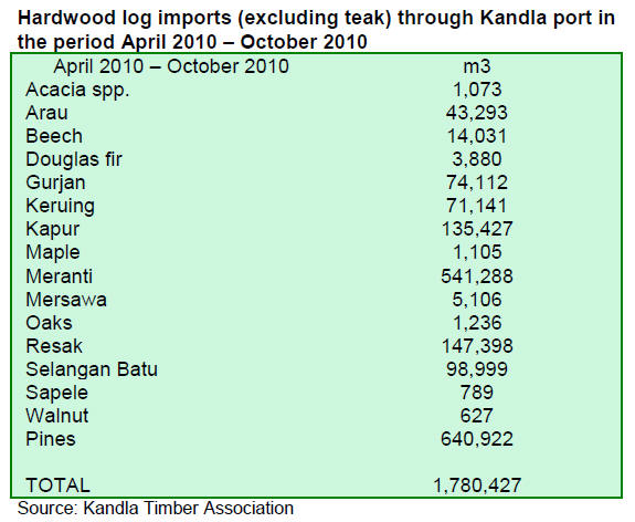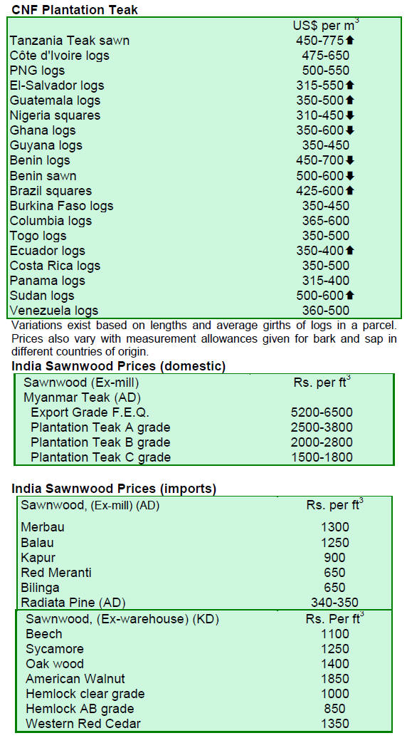 to local manufacturers Active auction sales in government depots Since prices of imported teak are increasing, the impact on depot sales is also apparent. Prices were up by 15% to 20% compared to previous auctions. Long length teak logs fetched Rs.2000-2200 per cu.m, medium quality Rs.1500-1700 per cu.m and lower grades were priced at Rs.900-1000 per cu.m. The hardwoods like Adina, Laurel and Pterocarpus marsupium (kinowood) fetched Rs.800-850 for select qualities and Rs.325-400 for lower grades. Demand is good for these species, but supplies are very limited due to conservation and effective control by the Forest department. Kerala afforestation programmes receive UN