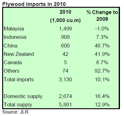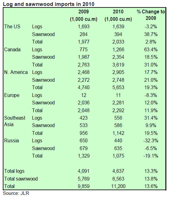 Japan was 14.894 million cu.m in 2010, up 13.2%