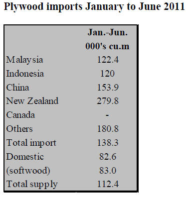total plywood supply (production plus imports) in Japan