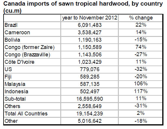 Canadian imports of tropical hardwoods are expected to grow at a faster